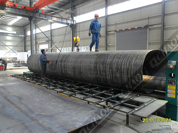掛車用卷板機(jī)增加托輥及上輥撓曲補(bǔ)償可使筒件取得較好的直線度??稍黾油馔辛霞芗皟?nèi)升料架使操作更便利,更少人工??膳浜锨昂蟮拦ば蜃魃a(chǎn)線優(yōu)化使用。